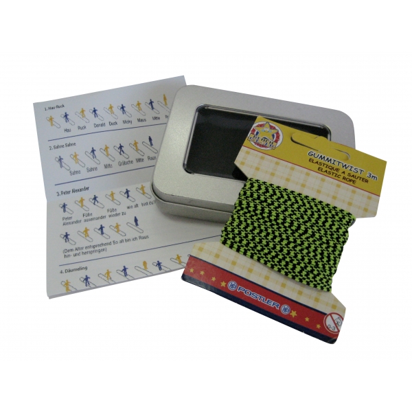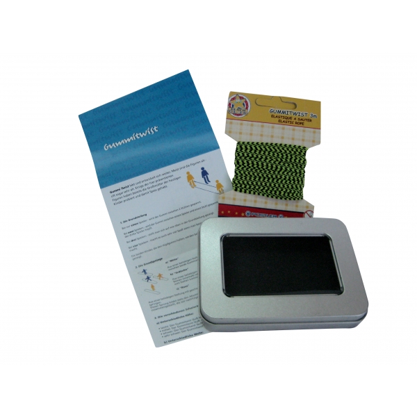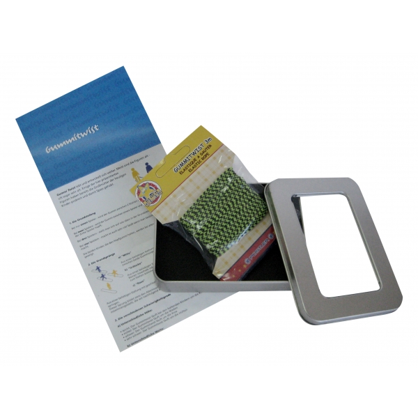 Die Rolle mit buntem Gummi befindet sich in einer Metalldose mit Klarsichfenster. Dazu gibt es eine kurze Erklärung des Spiels sowie eine Anleitung der möglichen Spieldurchgänge.