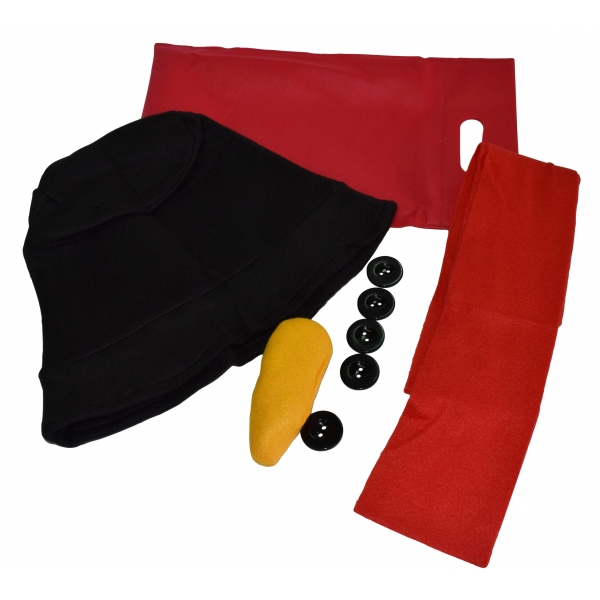 Schneemann-Set mit folgendem Inhalt: Fleeceschal, rot (120 x 9 cm), Fleece-Mütze, schwarz (20 x 29 cm), 5 x schwarze Kunststoffknöpfe (rund = 3 cm Durchmesser), gelb Fleece-Rübennase (ca. 5 x 11 cm), schön verpackt in im Polybeutel und kleiner, roter Non-Woventasche (19 x 34 cm)